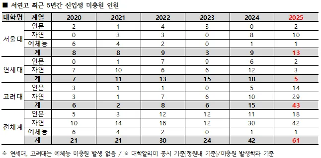 서연고는 추가모집을 실시하지 않지만 미충원 인원이 증가하는 추세를 보이고 있다. 2025학년도 기준 서울대 13명, 연세대 5명, 고려대 43명 등 총 61명이 미충원되었으며, 이는 5년 전 21명 대비 3배 증가한 수치다. 특히 자연계 학과에서 의대 중복합격으로 인한 이탈이 주요 원인으로 분석된다.
