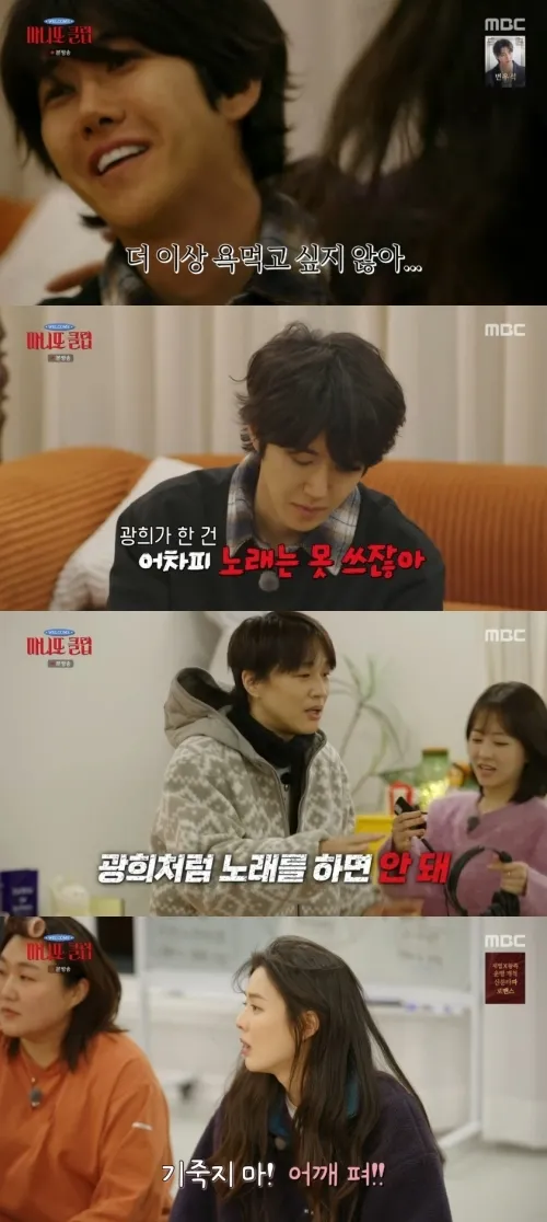 12일 방송된 MBC 신규 예능 '마니또 클럽'에서 광희가 응원가 녹음 중 차태현의 지적에 의기소침한 모습을 보였다.