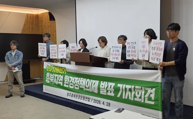 청주충북환경운동연합은 28일 충북도청에서 6·3지방선거 환경정책 의제를 발표하며 청주 도심 통과 충청권 광역급행철도(CTX) 대신 기존 충북선 활용과 트램 도입을 제안했다.