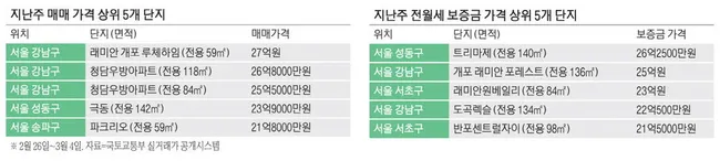 2월 셋째주 전국 아파트 최고 매매가는 송파구 롯데캐슬골드 36억5000만원이었으나, 넷째주에는 강남구 래미안 개포 루체하임 27억원으로 떨어졌다. 주간 최고가가 30억원을 밑돈 것은 이례적이다.