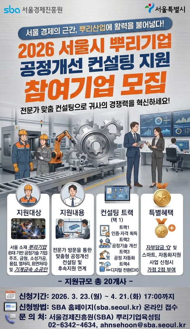 서울시와 서울경제진흥원은 주조, 금형, 소성가공 등 6대 기반 공정기술 분야 뿌리기업과 소공인 20개사를 선정해 10월까지 공정개선 컨설팅을 지원한다고 30일 밝혔다.