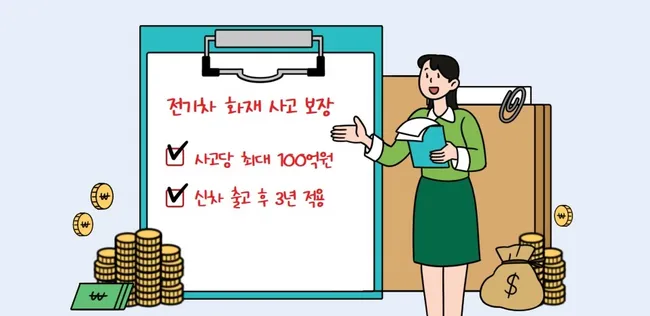 내년 3월부터 충전이나 주차 중 발생한 전기차 화재로 제3자에 대한 배상책임이 기존 보험의 보상 한도를 초과하면, 사고당 최대 100억원까지 보장하는 '무공해차 안심 보험'이 시행된다. 보장 기간은 신차를 출고한 날로부터 3년이다.