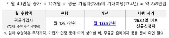 정부가 2007년 주택연금 제도 도입 이후 처음으로 수령액 산정 공식을 개편했다. 신규 가입자는 평균 월 129만 7000원에서 133만 8000원으로 월 4만 1000원(3.13%) 인상되며, 만 72세 기대여명 17.4년을 고려하면 평생 약 849만원을 더 받게 된다.