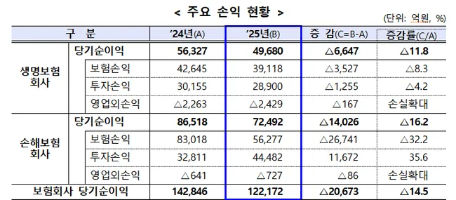 지난해 보험사 52개사의 당기순이익이 12조2172억원으로 전년보다 약 2조673억원(14.5%) 줄어들었다. 생명보험사는 손실계약 증가와 예실차 손실로 보험손익이 악화됐고, 손해보험사는 장기·자동차 손해율 상승으로 부진했다.
