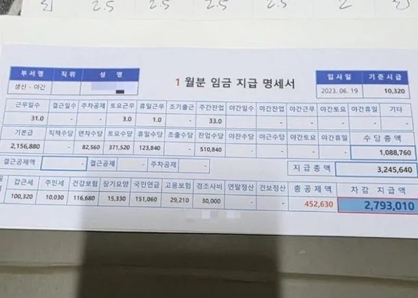 국내 제조 현장에서 일하는 태국 국적 남성이 월급 명세서를 공개해 화제가 됐다. A씨는 지난해 8월 기본급 209만원을 포함해 총 402만7045원을 수입했으며, 세금과 보험료를 제외한 실수령액은 345만4155원이었다.