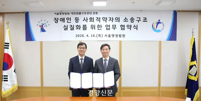 서울행정법원과 대한법률구조공단이 16일 장애인 등 사회적 약자를 위한 업무협약을 체결했다. 소송구조 결정을 받은 장애인이 집에서 공단 소속 변호사로부터 직접 법률상담을 받을 수 있는 절차가 마련됐다.
