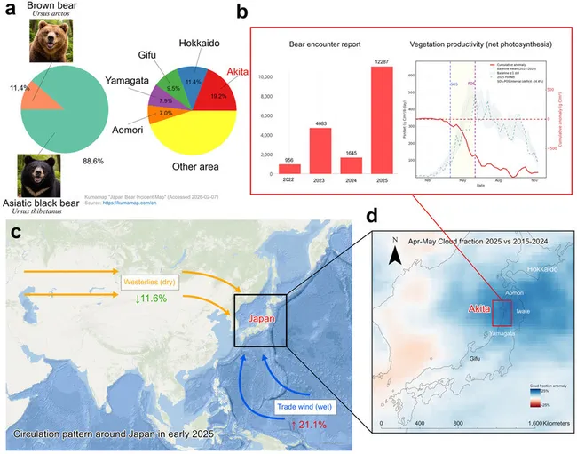 2025년 4~5월 일본 북동부의 구름량이 2015~2024년 대비 30% 이상 증가했으며, 라니냐 현상과 북극 온난화로 인한 서풍 약화가 따뜻하고 습한 공기를 유입시켰다. 이는 새싹 발아 부진과 개화 저해로 이어져 곰들이 먹이를 찾아 민가로 내려오게 만들었다.