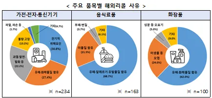 제조국이 확인된 536건 중 중국산이 62%로 가장 많았으며 일본(6.5%), 미국(5.6%)이 뒤를 이었다. 가전·전자·통신기기는 감전 위험 등 전기적 위해 요인이 30.8%로 가장 많은 리콜 사유였고, 음식료품은 유해·알레르기 유발 물질, 화장품은 유해·화학물질 함유가 주요 원인이었다.