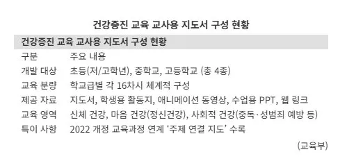 교육부가 7일 학교 보건 수업용 건강증진 교육 교사용 지도서를 배포했다. 지도서에는 딥페이크 성범죄 예방, 도박 중독, 기후 위기 건강 문제 등 현대 사회의 건강 위협 요소들이 포함됐다.