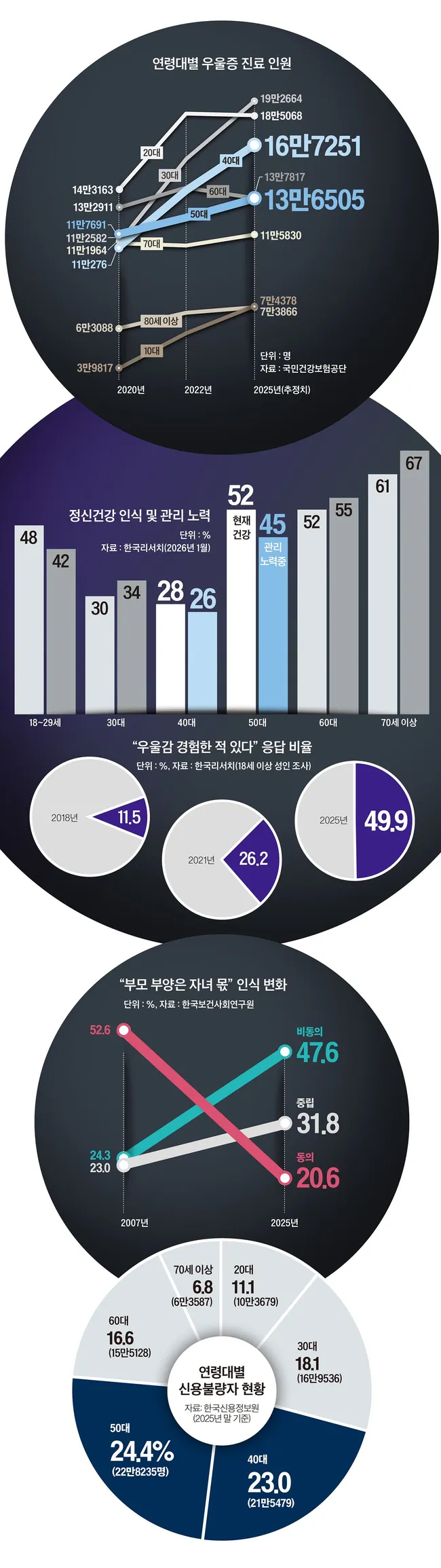 부모를 직접 부양하는 마지막 세대이면서 자녀에게 부양받지 못할 첫 세대인 '마처세대' 4050이 이중 부양의 굴레 속에서 심신이 붕괴되고 있다. 국민건강보험공단 조사에 따르면 40대 우울증 진료 환자는 2020년 11만276명에서 2025년 16만7251명으로 52% 급증했으며, '차라리 죽는 게 낫겠다'고 생각한 40대도 4.6%에서 22.2%로 크게 늘었다.