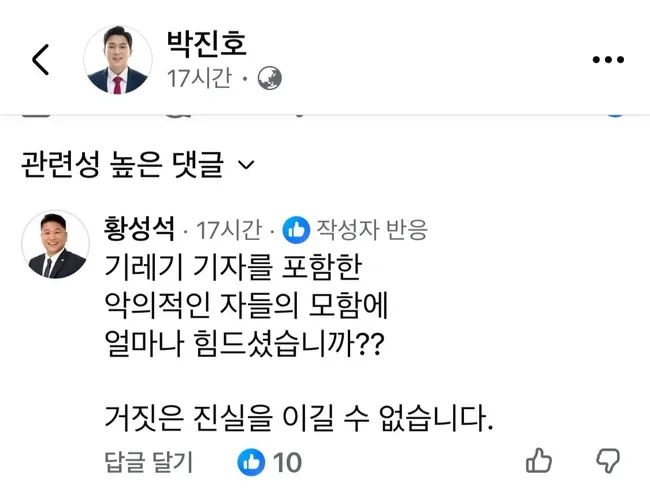 황 의원은 박 위원장의 SNS에 남긴 댓글에서 사실에 기반한 언론 보도를 '모함'으로 규정하고 언론인을 조롱했다. 논란이 커지자 뒤늦게 '기레기' 표현을 삭제하고 사과했으나, 대법원도 모욕죄 성립 가능성을 인정한 비하 용어를 사용한 것은 공직자로서 부적절하다는 지적이 나온다.