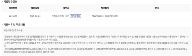 안철수 국민의힘 의원이 12월 24일 대학입학전형시행계획 공표 시기 준수 의무를 강화하는 '고등교육법 개정안'을 대표 발의했다. 개정안은 법정 기한 내에 대입전형을 공표하지 않거나 변경 사항 공개를 지체한 대학에 1000만원 이하의 과태료를 부과하고 재정지원 제한까지 고려하도록 했다.