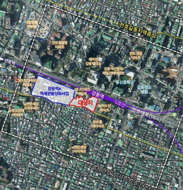 강동역 일대가 주거·업무·여가 기능을 갖춘 직주락 복합 생활권으로 재편될 전망이다. 역세권 연계 개발로 보행 여건 개선과 생활 인프라 확충이 기대된다.