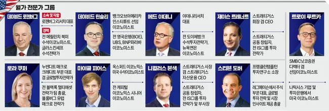 참여 전문가는 로젠버그리서치 대표 데이비드 로젠버그, BoA 인스티튜트 선임이코노미스트 데이비드 틴슬리, 야데니리서치 대표 에드 야데니, 스트래티거스 회장 제이슨 드 세나 트레너트, 누빈 매크로크레디트 부문 대표 로라 쿠퍼, 옥스퍼드이코노믹스 수석이코노미스트 마이클 피어스, 스트래티거스 사장 니컬러스 본색, 프랭클린템플턴 투자연구소장 스티븐 도버, SMBC닛코증권 수석이코노미스트 트로이 루트카 등이다.