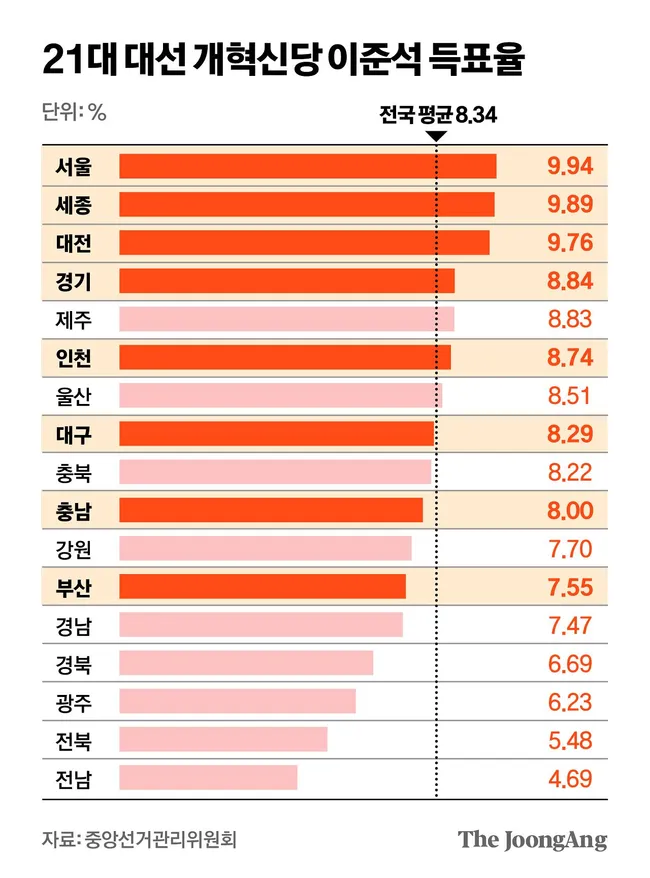 개혁신당이 후보를 낸 지역들은 이준석 대표가 21대 대선에서 유의미한 득표율을 얻은 곳들이다. 이 대표는 전국 평균 8.34% 득표율을 기록했고, 서울(9.94%)·세종(9.89%)·대전(9.76%)·경기(8.84%) 등에서 높은 지지를 받았다. 현재 개혁신당 정당 지지율은 2~3%에 불과하지만, 거대 양당의 접전 지역에서 예상 이상의 득표를 한다면 보수 진영 당선 가능성에 영향을 미칠 수 있다.