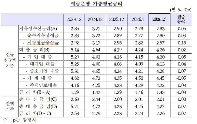 2월 신규취급액 기준 예금은행의 가계 주담대 금리가 연 4.32%로 집계되어 2023년 12월 이후 27개월 만에 최고치를 기록했다. 지표금리인 은행채 5년물 금리가 상승한 데 따른 결과로, 지난해 10월 이후 5개월 연속 상승세를 이어가고 있다.