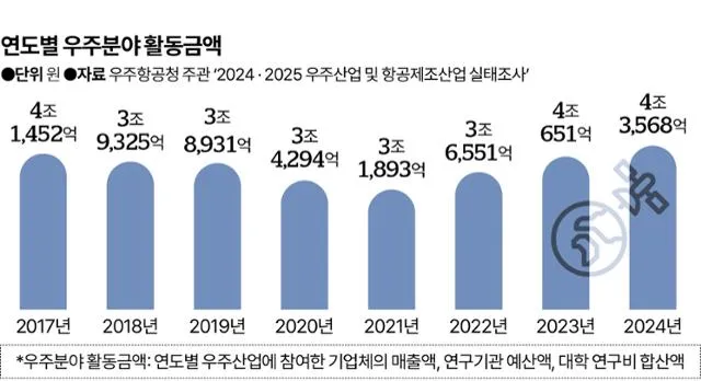 현재 한국은 위성체 제작 부품의 77.8%를 수입에 의존하고 있으며, 우주분야 활동금액이 2017년 이후 7년간 정체 상태를 벗어나지 못하고 있다. 정부가 우주 기술을 개발해 민간에 이전하는 구조가 고착화되면서 우주산업 성장이 저해되고 있는 상황이다.