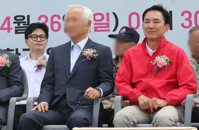 한동훈 전 국민의힘 대표와 박민식 전 국가보훈부 장관이 26일 부산 북구 구포초등학교 체육행사에서 처음 만났다. 두 사람은 악수 후 별다른 대화 없이 각자 동선을 달리하며 신경전을 벌였다.