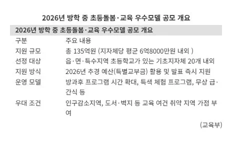 교육부는 인구감소지역과 도서·벽지에 가점을 부여해 지원을 강화할 방침이며, 2026년 단년도 시범 사업으로 운영 후 2027년부터는 지자체가 자율적으로 이어가게 된다.