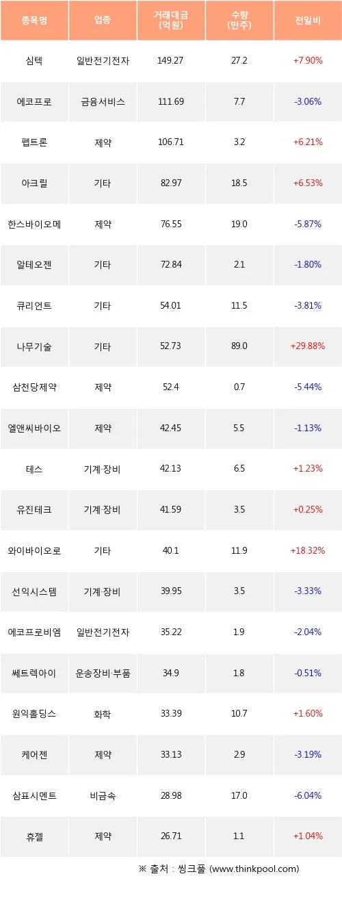 심텍은 7.9% 상승했으나 에코프로·지투지바이오는 각각 3.06%·15.66% 하락했다. 제약·2차전지 내 개별 기업 전망 차이가 매매 분산으로 이어졌다.