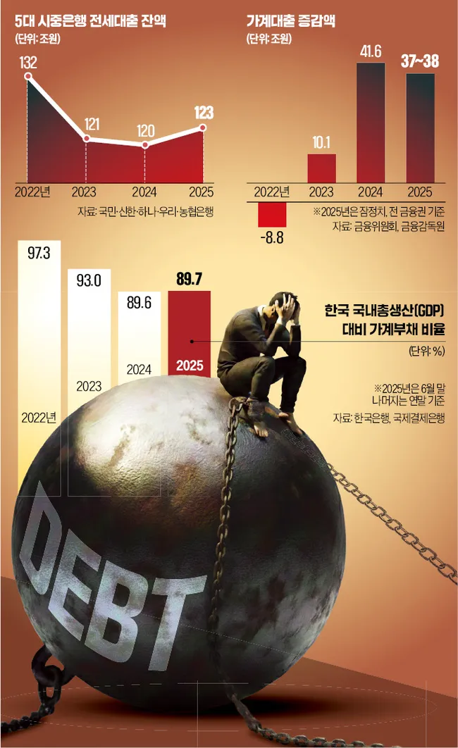 정부는 국내총생산(GDP) 대비 가계부채 비율을 현재 89.7%에서 80%까지 낮추는 것을 정책 목표로 설정했다. 한국은행에 따르면 1인당 평균 가계대출 잔액은 9721만원으로 2012년 이후 최대치를 기록했다.