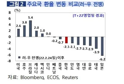 중동 전쟁 발발 후 22영업일간(2월 27일~3월 31일) 원화 가치가 달러 대비 6.3% 하락해 주요 15개국 중 최대 낙폭을 기록했다. 2022년 러시아·우크라이나 전쟁 때보다 급격한 하락세다.
