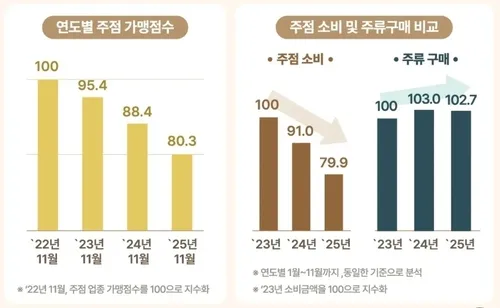 높은 물가와 건강을 중요시하는 트렌드 확산으로 술자리 수요가 감소했으며, 주점 가맹점 수도 3년 전 대비 19.7% 줄어들었다. 연령대별로는 20대의 주점 소비 감소폭이 20.9%로 가장 컸고, 60대 이상 시니어층이 '홈술' 트렌드를 주도하고 있다.