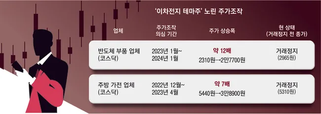검찰이 '이차전지 신사업 진출' 허위 공시로 주가를 조작한 세력에 대한 본격 수사에 착수했다. 코스닥 상장사 2곳에서 허위 보도자료와 공시를 배포해 주가를 각각 12배, 7배 이상 급등시킨 혐의가 확인됐다.