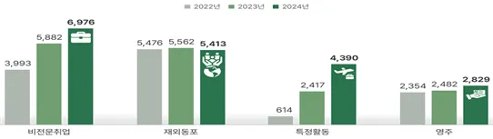 남성 외국인이 67.4%로 여성보다 두 배 가까이 많으며, 이는 울산의 제조업 중심 산업도시라는 지역적 특성을 반영한 것이다. 연령별로는 30대가 33.9%로 가장 큰 비중을 차지했고, 체류 자격으로는 비전문취업(E-9) 비자 보유자가 19.8%로 가장 많았다. 고용허가제 외국인 근로자는 6510명으로 전년 대비 28.3% 증가했으며, 스리랑카 출신이 17.2%로 최다를 기록했다.