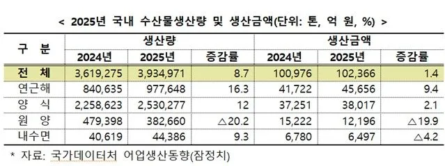 연근해어업과 해면양식업이 성장을 주도했다. 연근해어업은 낮은 수온으로 형성된 양호한 어장 덕분에 16.3% 증가했으며, 고등어는 62.1%, 오징어는 128.5% 급증했다. 해면양식업은 12% 성장했고 주력 품목인 김은 신규 면허 개발과 기상 호조로 30.1% 증가했다. 반면 원양어업은 태평양 어장 형성 저조로 20.2% 감소했다.