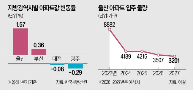 울산 경제의 빠른 성장이 주요 원인으로 분석된다. 작년 4분기 울산의 지역내총생산(GRDP)은 전년 동기 대비 2.2% 증가해 전국 지방 광역시 중 가장 높았으며, 조선업 호황으로 HD현대중공업의 영업이익이 전년 대비 200% 가까이 증가했다. 동시에 아파트 공급 부족이 가격 상승을 가속화하고 있는데, 울산의 아파트 입주 물량은 2023년 8882가구에서 지난해 4215가구로 반토막 났다.