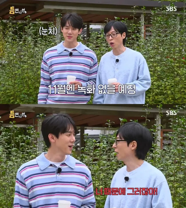 코미디언 유재석이 배우 유연석의 바쁜 스케줄로 인해 SBS '틈만 나면' 11월 녹화를 진행하지 못했다고 밝혔다.