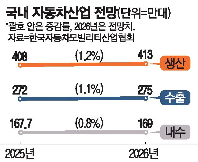 2026년 국내 자동차 생산은 413만여 대로 2025년(408만대)보다 1.2% 소폭 증가할 전망이다. 내수는 169만대(0.8% 증가), 수출은 275만대(1.1% 증가)로 예상되며, 전기차 보조금 확대와 신차 출시, 노후차 교체 수요가 성장을 견인할 것으로 보인다.