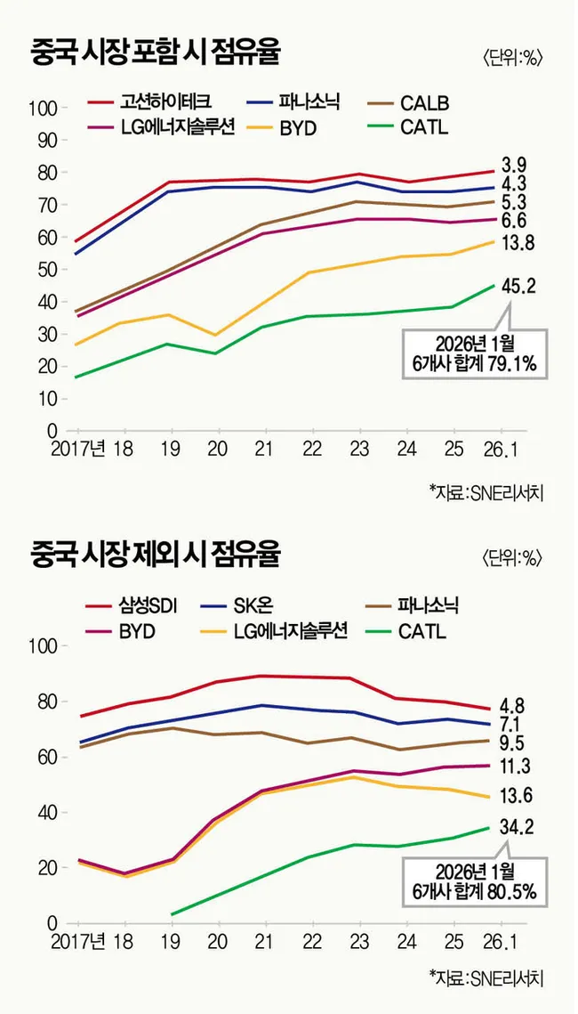 중국 배터리 업체들이 시장을 주도하고 있다. CATL은 45.2% 점유율로 1위를 유지했고, BYD는 13.8%로 2위를 기록했다. 중국 시장을 제외한 글로벌 기준에서도 국내 3사 합산 점유율은 25.5%로 10.4%포인트 하락했다.