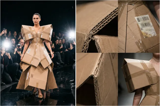 프랑스 명품 브랜드 발렌시아가가 선보인 것으로 알려진 택배 박스 드레스 사진이 소셜네트워크서비스에서 화제를 모았다. 배송 정보 바코드와 포장 테이프가 붙은 골판지 상자로 만든 드레스를 유명 배우들이 입은 모습이 공개되면서 많은 사람들이 실제 패션 아이템으로 믿었다.