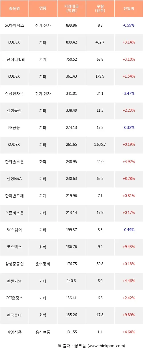 기관 투자자가 16일 삼성SDI·현대차 등 운수장비 3종목을 집중 매도한 뒤, 20일 SK하이닉스·한화솔루션 등 화학·반도체 업종으로 매수 방향을 전환했다. 순매도 상위 20개 중 운수장비가 3종목, 순매수 상위에선 화학이 3종목을 차지했다.