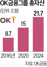 OK금융은 2002년 최윤 회장이 세운 대부업체 원캐싱에서 출발해 저축은행·캐피털·NPL·간편결제·증권업 등으로 사업 영역을 확장했으며, 2016년 8조원대이던 자산 규모를 20조원 이상으로 늘렸다.