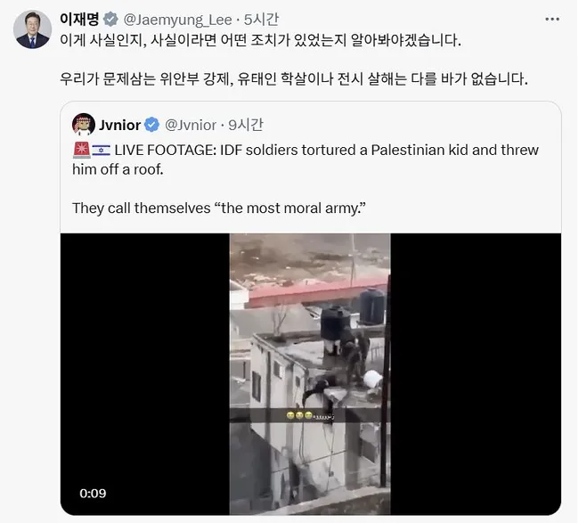 이재명 대통령이 10일 X 계정에 공유한 이스라엘 병사의 팔레스타인 아이 고문 영상이 실제로는 2024년 9월 시신 영상을 왜곡한 가짜뉴스였다. 대통령은 '사실인지 알아봐야겠다'는 단서를 달았으나 검증 없이 영상을 공유했고, 이스라엘 외무부의 강력 항의로 외교 마찰로 비화했다.