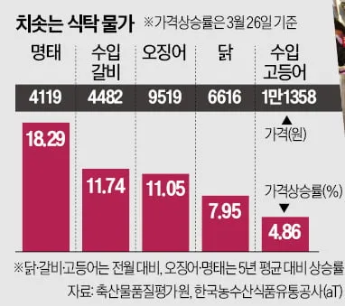 중동 전쟁으로 국제 유가와 물류비가 급등하면서 국내 식탁과 외식 물가가 요동치고 있다. 닭 가격은 지난달 대비 7.95% 올랐고, 명태는 평년 대비 18.29%, 오징어는 11.05% 상승했다. 아라비카 원두 가격도 한 달 새 10% 이상 뛰어 커피 프랜차이즈들의 가격 인상으로 이어졌다.