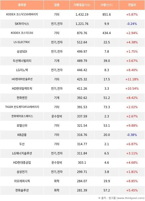 기관은 KODEX 코스닥150레버리지를 최다 매수하며 코스닥 지수 상승에 베팅했다. 외국인은 한화에어로스페이스를 1위로 사들이며 방산주 선호를 이어갔다.