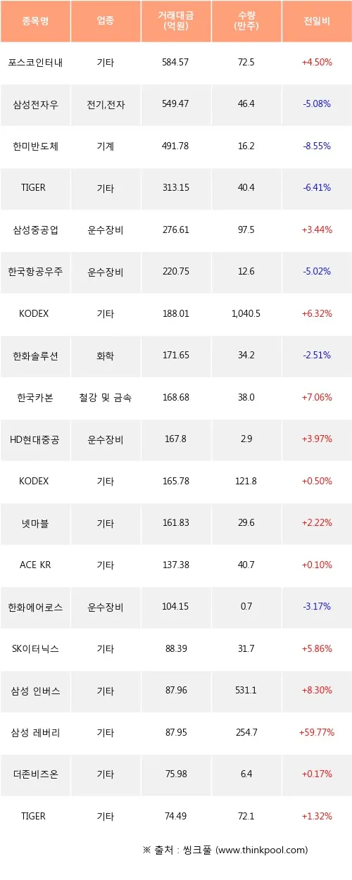 반도체 레버리지 ETF와 SK스퀘어·삼성물산 등 계열사도 동반 매도됐다. 기관은 같은 기간 포스코인터내셔널·삼성중공업 등 운수장비 4개 종목은 순매수하며 업종 간 자금 이동 양상을 보였다.