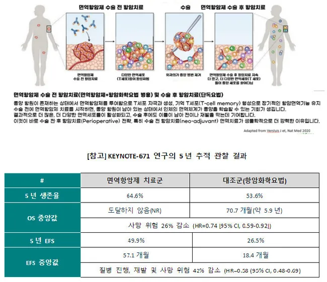 미세 전이 가능성을 고려해 수술 가능한 폐암도 4기처럼 가정해 치료하는 전략이 강조된다. 면역항암제(펨브롤리주맙) 수술 전후 병용 치료는 5년 생존율을 53.6%에서 64.6%로 개선했으며, 재발·진행·사망 위험도 42% 감소시켰다.