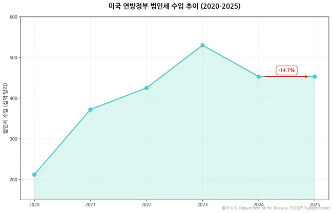 그러나 기업 이익이 급증한 반면 법인세 수입은 전년 대비 14.7% 감소했다. AI 인프라 투자에 대한 보너스 감가상각 혜택으로 기업들이 첫해에 투자금 전액을 비용으로 처리하면서 세무상 소득이 '0'에 수렴하기 때문이다.