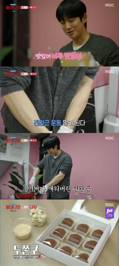 1일 방송된 MBC '마니또 클럽'에서 정해인이 마니또 고윤정을 위해 두쫀쿠를 직접 만들었다. 피스타치오 껍질을 손수 까고 마시멜로를 치대며 전완근을 자랑하는 등 제작 과정을 공개했다.