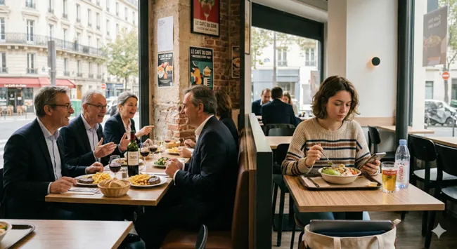 프랑스 Z세대 직장인들 사이에서 동료들과 와인을 곁들여 여유롭게 점심을 즐기던 전통이 사라지고 혼자 식사하는 '혼밥' 문화가 확산되고 있다. 25세 미만 직원의 29%가 정기적으로 혼자 점심을 먹으며, 세대가 젊을수록 혼밥 비율이 높은 것으로 조사됐다.