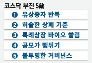 코스닥 상장사 45%가 적자 상태이며, 시가총액 상위 10개 기업 중 4곳도 지난해 적자를 기록했다. 유상증자·전환사채 발행으로 주주가치를 희석하는 한계기업들이 지수를 짓눌렀으며, 허술한 상장폐지 기준과 불투명한 지배구조가 문제로 지적된다.