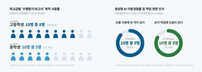 드림베이스가 전국 중·고등학생 1만7381명을 대상으로 실시한 '2025 청소년 생성형 AI 사용현황 실태조사'에서 고등학생의 79.6%가 수행평가 및 보고서 작성에 AI를 활용하는 것으로 나타났다. 전체 응답자의 86.1%가 생성형 AI 사용 경험이 있으며, ChatGPT가 97.4%로 압도적 1위를 차지한 반면 국산 AI 서비스 중에는 뤼튼(20.5%)만 두 자릿수를 기록했다.