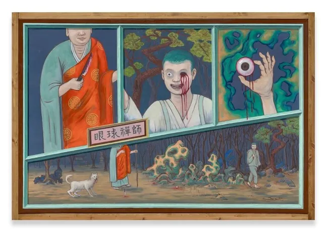'안구선사' 연작은 손가락을 자르는 구지선사 이야기를 눈알로 재구성했다. 단청의 붉고 푸른 색감으로 기묘함을 더한 이 작품은 타인의 시선과 자신의 시선을 구별하지 못하는 현대인의 정체성 혼란을 암시한다.
