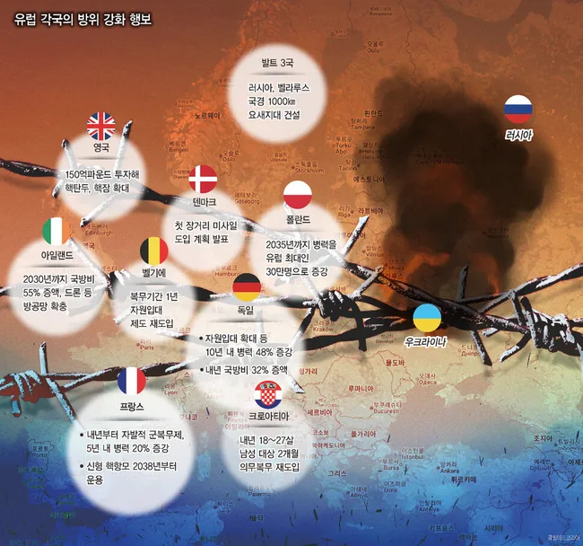 프랑스는 내년부터 자발적 군 복무 제도를 도입해 병력을 24만명에서 29만명으로 늘리기로 했고, 독일은 2027년부터 18살 남성 신체검사를 의무화하며 현역병을 18만3000명에서 최대 27만명으로 확대할 계획이다. 영국은 핵탄두 증강과 핵추진 잠수함 건조에 향후 10년간 150억파운드를 투자하기로 했으며, 폴란드는 국방비를 GDP 대비 4.7%로 끌어올려 나토 회원국 최고 수준을 기록했다.