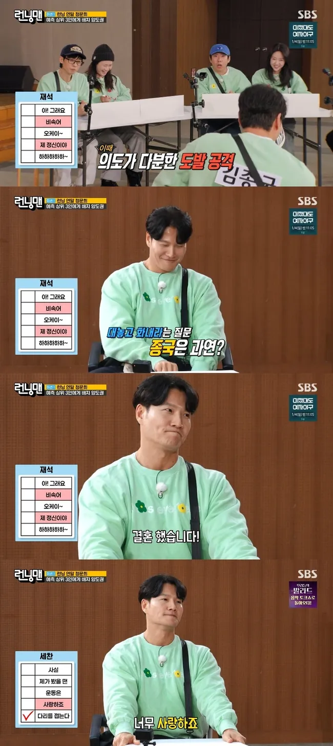28일 방송된 SBS 예능 프로그램 '런닝맨'에서 유재석이 김종국의 결혼 생활에 대해 추궁했다.